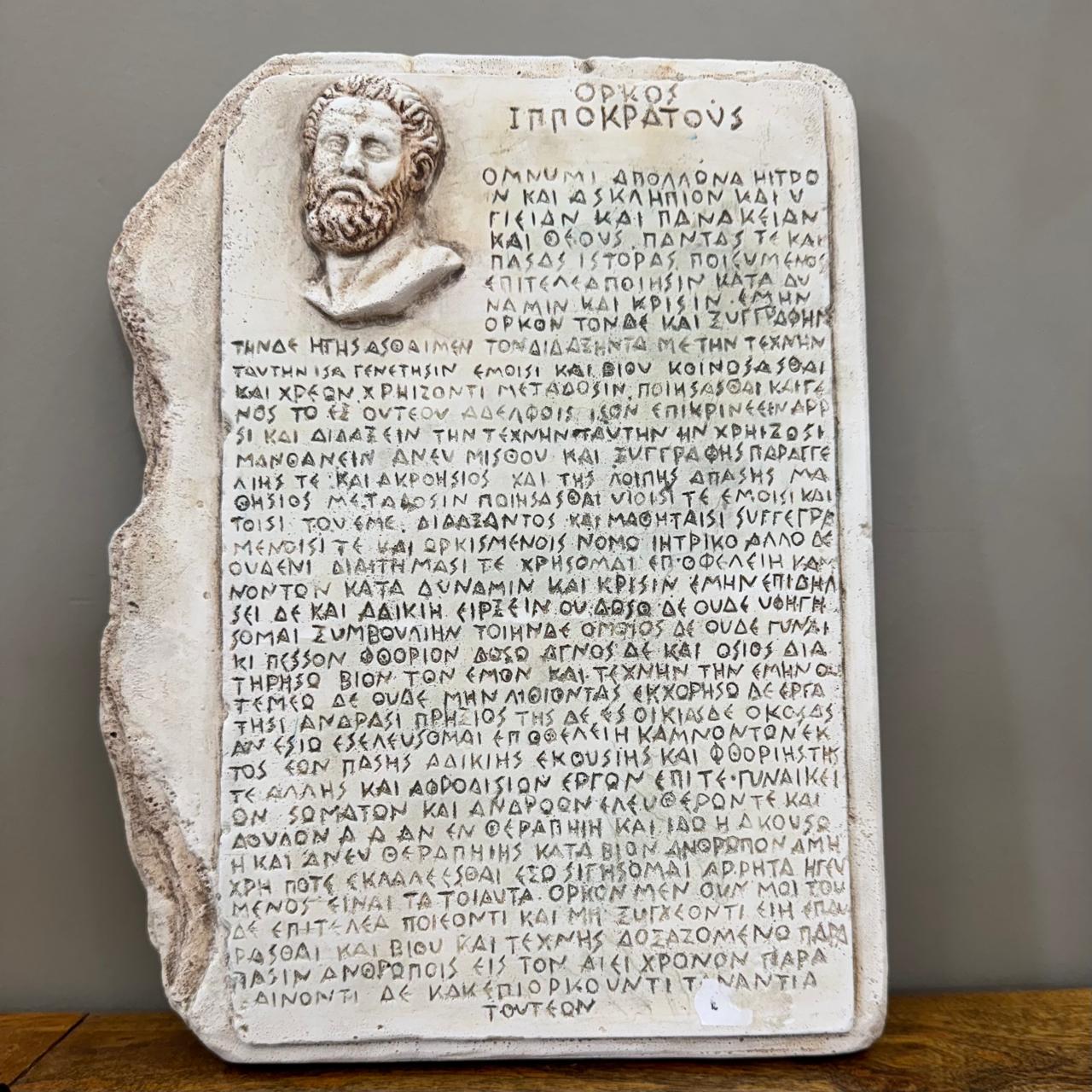 Hippocratic oath engraved on baked plaster in Ancient Greek language.