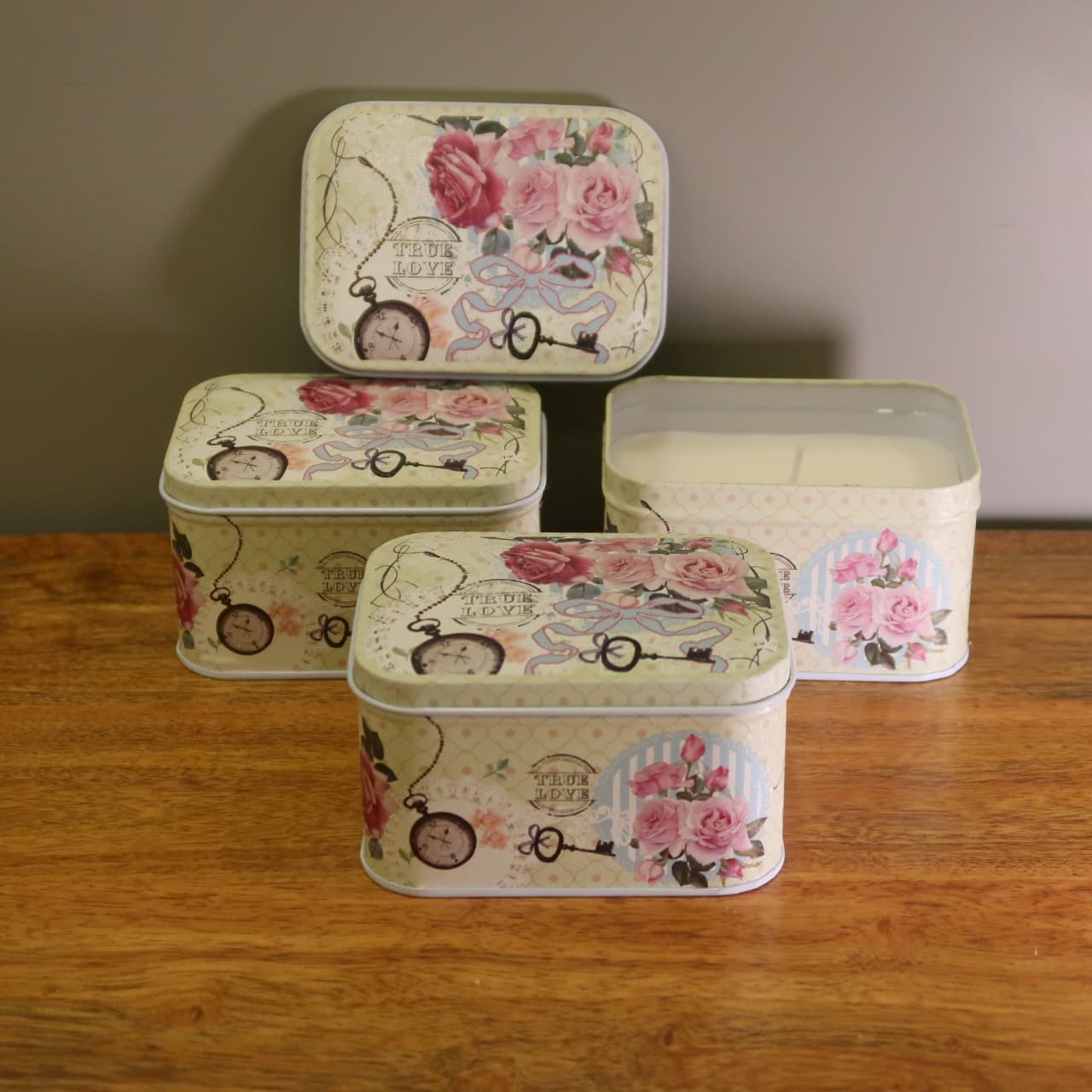 Metal, rustique print container with lid, dimensions: 11cm (L) x 8cm (W) x 6cm (H).